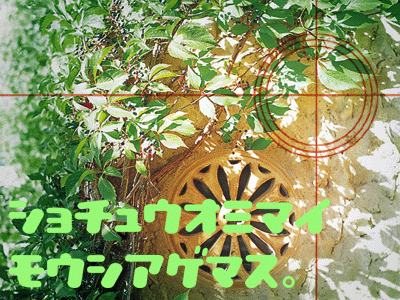 2000年の暑中見舞いです。暑苦しい写真をいかに涼しげに見せるか……考えてこうなりました。円と十字で太陽をイメージして、夏を強調(笑)。 どうもこの手のは、自分で作ってると思われ ないようですが、写真はさすがに写真ですが、加工は自分でしています。